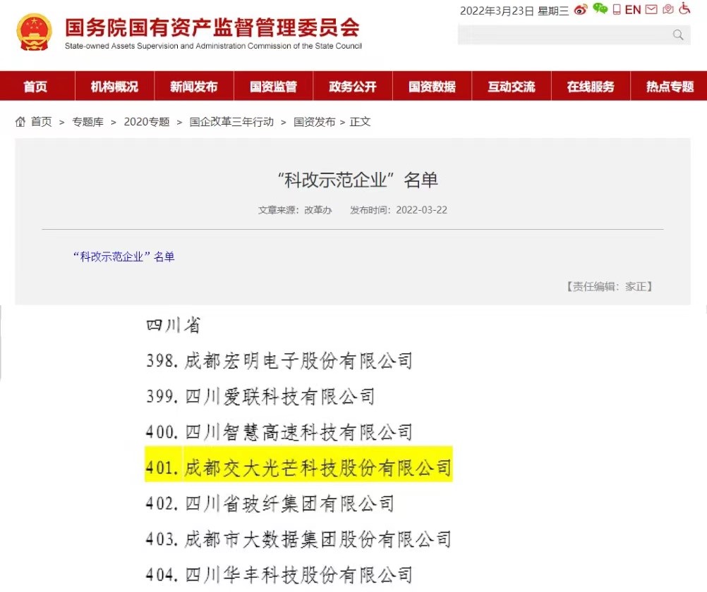 3月22日,交大光芒作為四川省七家入選企業(yè)之一,被國務院國資委納入“科改示范行動”企業(yè),此次“入選”,是繼2021年入選四川省國資委“天府國企綜合改革行動”企業(yè)的又一重大突破,也是省屬科技型企業(yè)中為數(shù)不多的“雙入選企業(yè)”,給公司深化改革、自主創(chuàng)新、跨越發(fā)展再添新活力。
