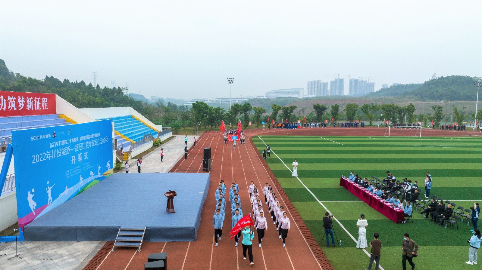 9時30分,楊洪宣布:“2022年川投能源-資陽口腔職學院職工運動會開幕!”彩煙騰空而起,全場掌聲雷動,歡呼不斷,正式拉開比賽帷幕。