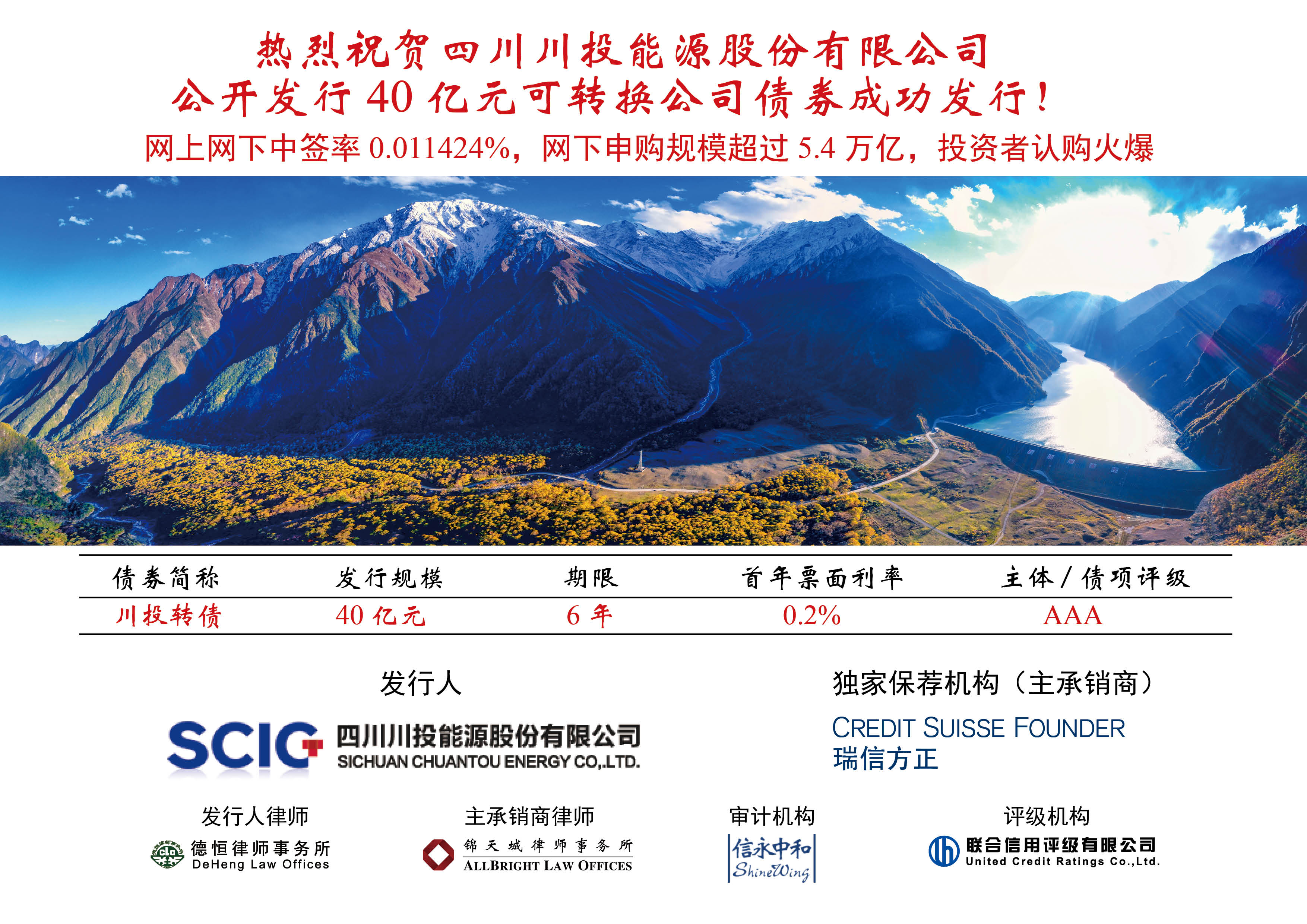 2019年11月15日,四川省投資集團(tuán)有限責(zé)任公司(簡(jiǎn)稱“川投集團(tuán)”)控股四川川投能源股份有限公司(簡(jiǎn)稱“川投能源”,600674.SH)公開發(fā)行A股40億元可轉(zhuǎn)換公司債券工作取得圓滿成功!40億元募集資金已全額到賬!這不僅是川投能源歷史上規(guī)模最大的一次融資,更標(biāo)志著川投集團(tuán)控股的川投能源上市公司6年資本市場(chǎng)融資工作實(shí)現(xiàn)破冰。對(duì)于川投集團(tuán)和川投能源優(yōu)化融資債務(wù)結(jié)構(gòu),做優(yōu)做強(qiáng)做大能源主業(yè),以及促進(jìn)四川省國有企業(yè)借助資本市場(chǎng)實(shí)現(xiàn)高質(zhì)量發(fā)展意義重大!