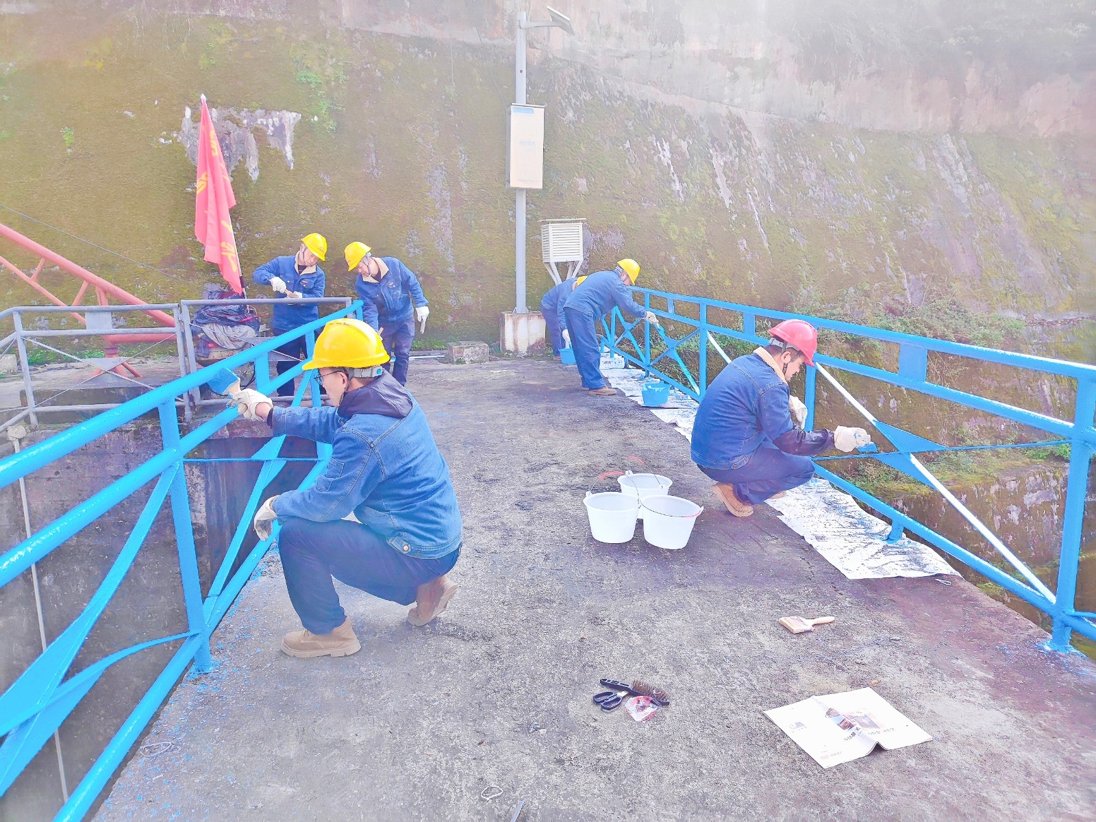 活動開始前第三支部黨員進行了充分的準(zhǔn)備和周密的分工,大家各司其職,迅速就位。刷漆過程中,有的負(fù)責(zé)初步清理護欄銹跡和污垢,為后續(xù)刷漆做好充分準(zhǔn)備;有的則手持油漆刷等工具,細(xì)致地為護欄和金屬結(jié)構(gòu)一遍遍涂上新的油漆。無論是經(jīng)驗豐富的老員工,還是朝氣蓬勃的青年黨員,都干得熱火朝天。原本銹跡斑斑的近千米護欄和金屬結(jié)構(gòu)逐漸煥然一新,為鳳鳴湖水庫增添了一抹亮麗的色彩。